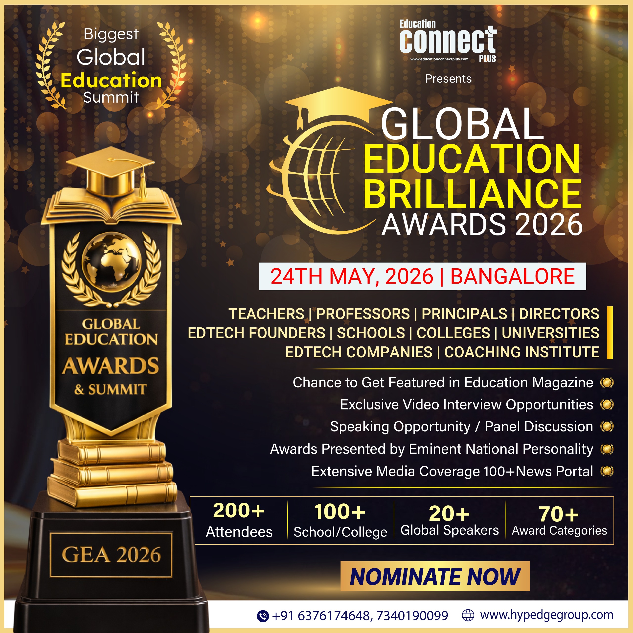 The Global Education Brilliance Awards & Summit (GEBA) is a prestigious platform dedicated to celebrating the visionaries, educators, institutions, and innovators who are redefining the future of education. Organised by Hypedge and Education Connect Plus Magazine, the 2026 edition brings together the brightest minds in education on May 24, 2026, in Bangalore, Karnataka — for an evening of recognition, inspiration, and meaningful connection. GEBA is not just an awards ceremony; it is a movement that honours excellence and amplifies the voices that are shaping tomorrow's learners today.